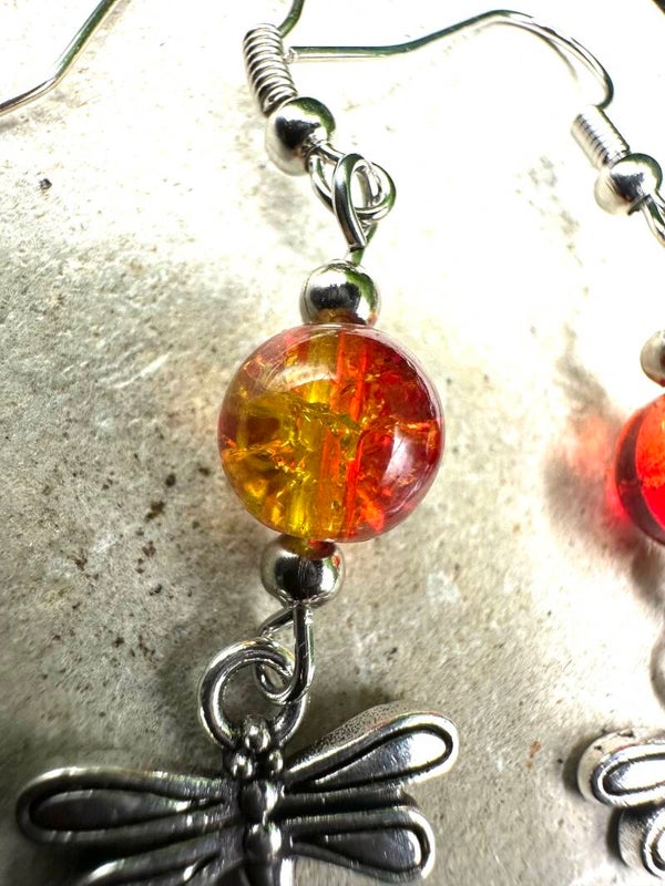 Breloque En métal Argenté Perle craquelés 8mm en verre automne 🍂 rouge orange jaune Crochet anti allergie en acier inoxydable et stoppeur en silicone Taille 3cm de hauteur