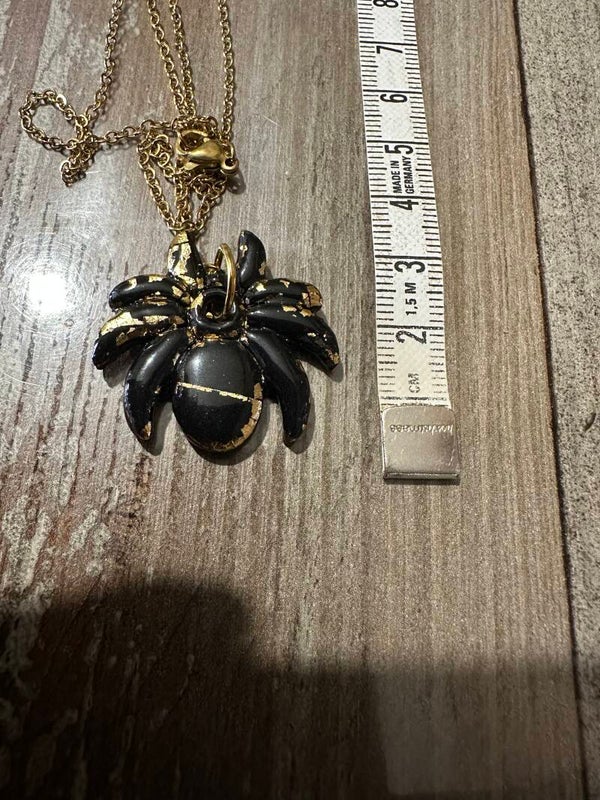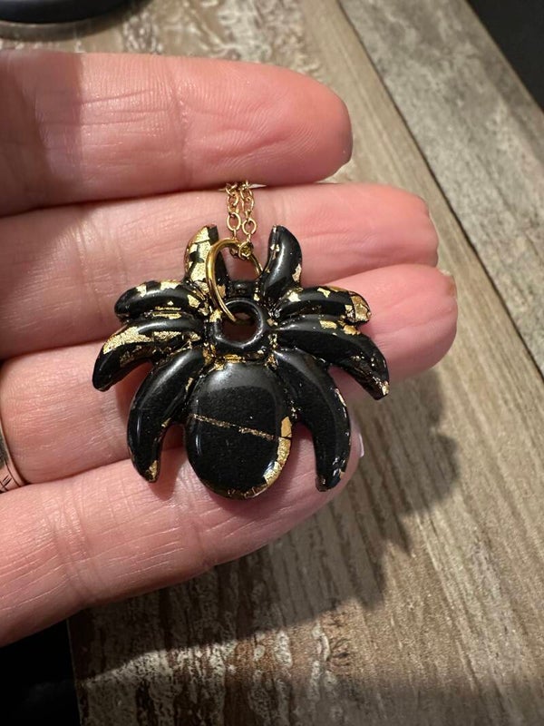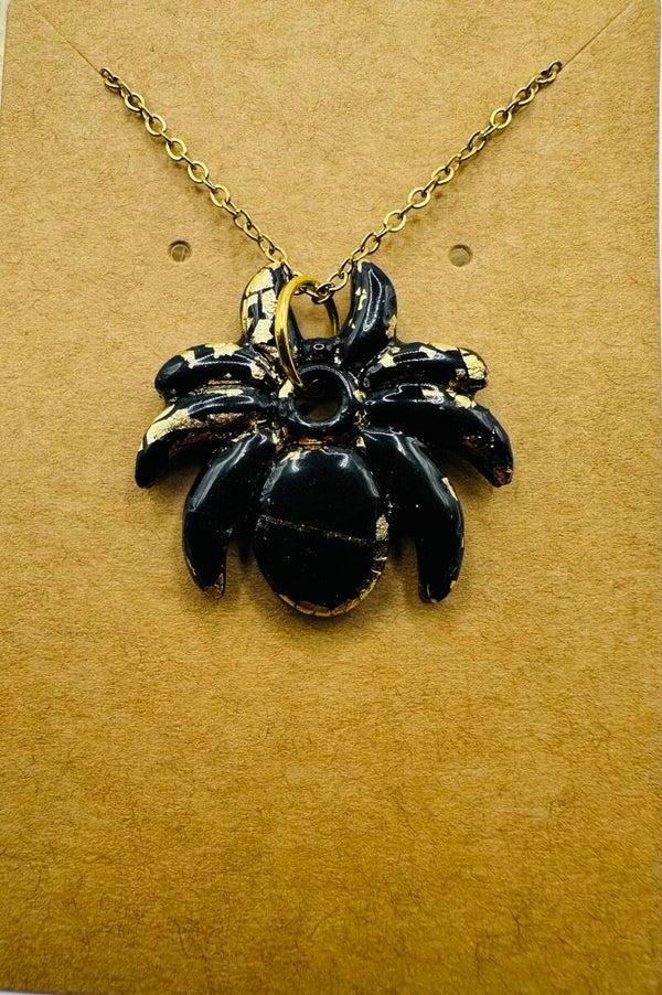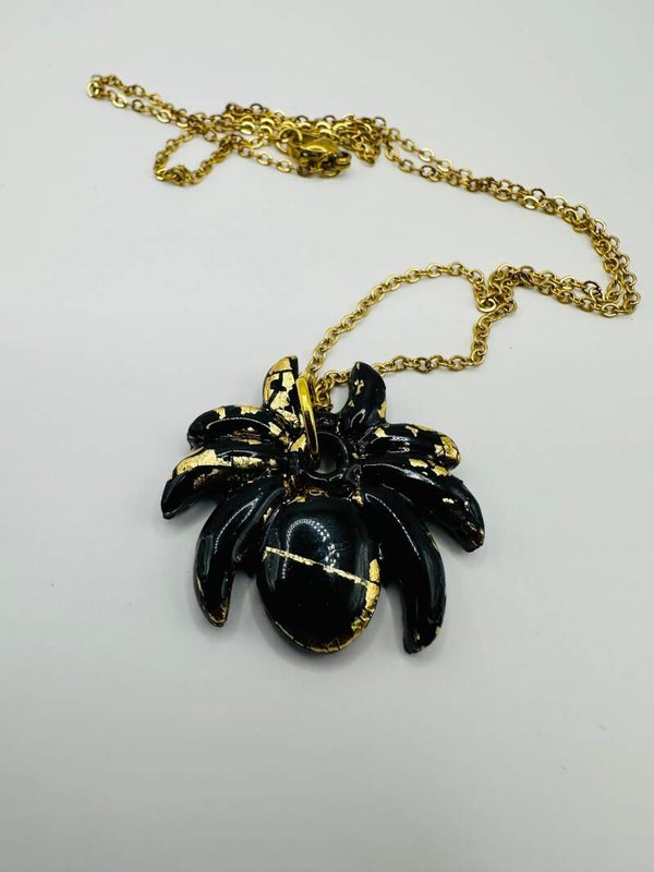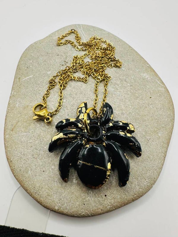 Collier « Araignée Noire et Or » – Création artisanale en pâte polymère