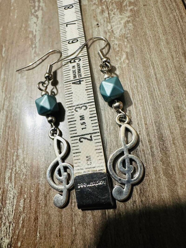 Chaque boucles d’oreilles est composé d’un pendentif en forme de clé de sol en métal, symbole intemporel de mélodie et d’harmonie, accompagné d’une perle géométrique bleu givré qui apporte une touche délicatement moderne.