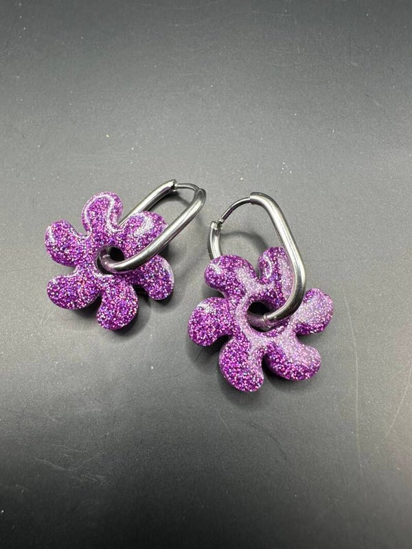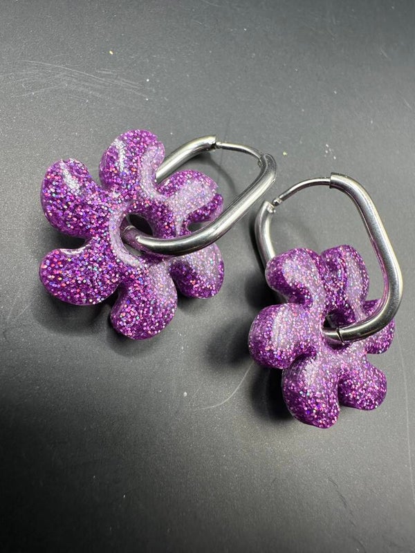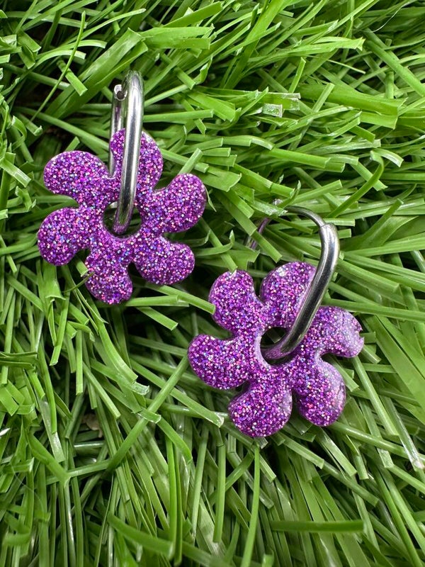 Laissez-vous séduire par l’éclat irrésistible de ces boucles d’oreilles en forme de fleur, entièrement façonnées à la main en résine et paillettes mauve.
