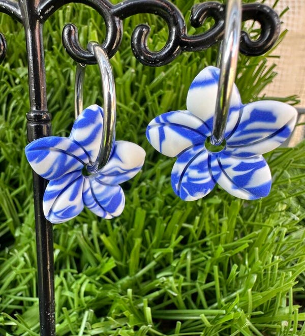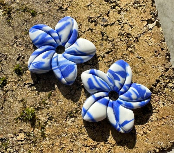 Modelées à la main en pâte polymère, chaque fleur dévoile de subtils tourbillons bleus et blancs, rappelant les motifs d’une porcelaine fine.