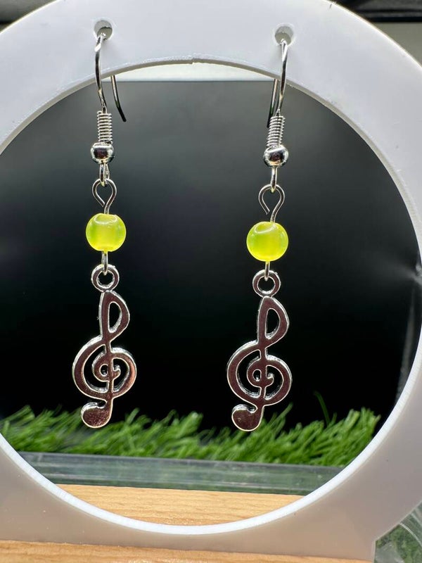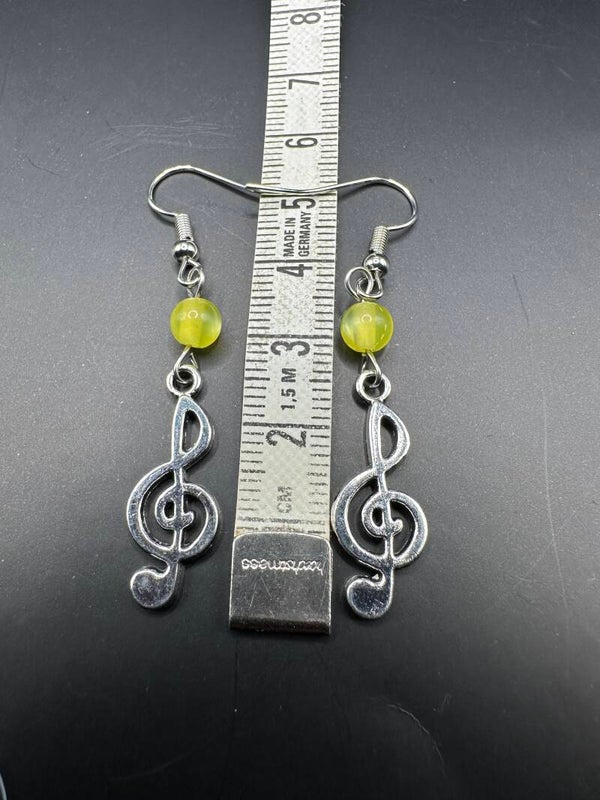 Ces boucles d’oreilles originales allient la douceur d’une perle jaune translucide à l’élégance d’un pendentif en forme de clé de sol argentée.