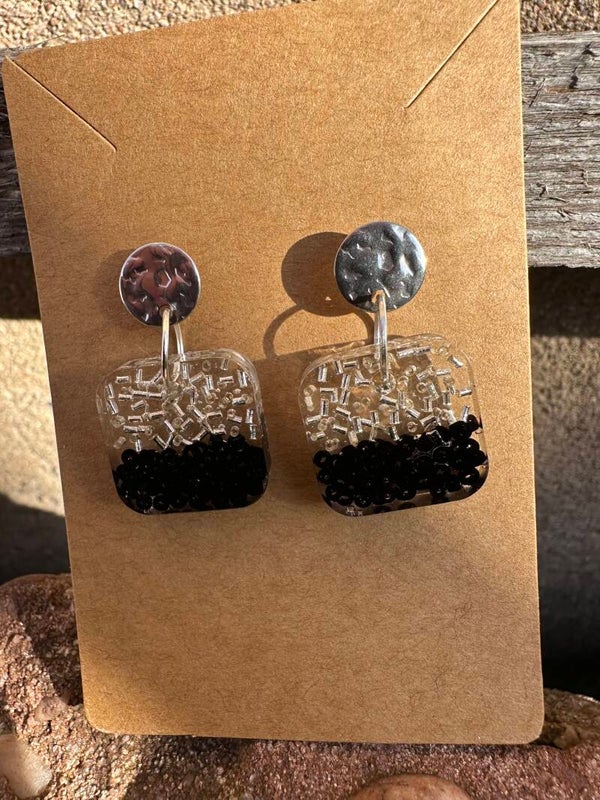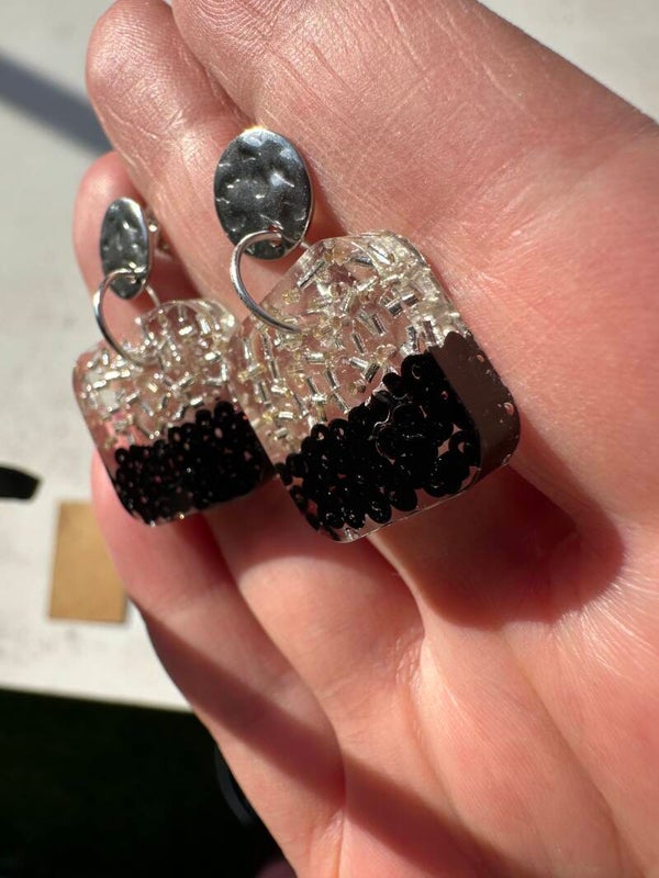 Leur pendentif carré en résine cristalline renferme un jeu de perles de rocailles transparentes, évoquant des éclats de givre, tandis qu’à leur base se mêle une pluie de rocailles noirs pour un contraste graphique et raffiné.