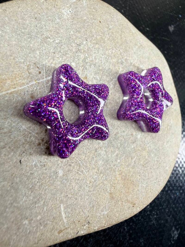 Comme tombées d’un ciel violet constellé, ces boucles d’oreilles en forme d’étoiles illuminent le visage de leurs reflets pailletés.
