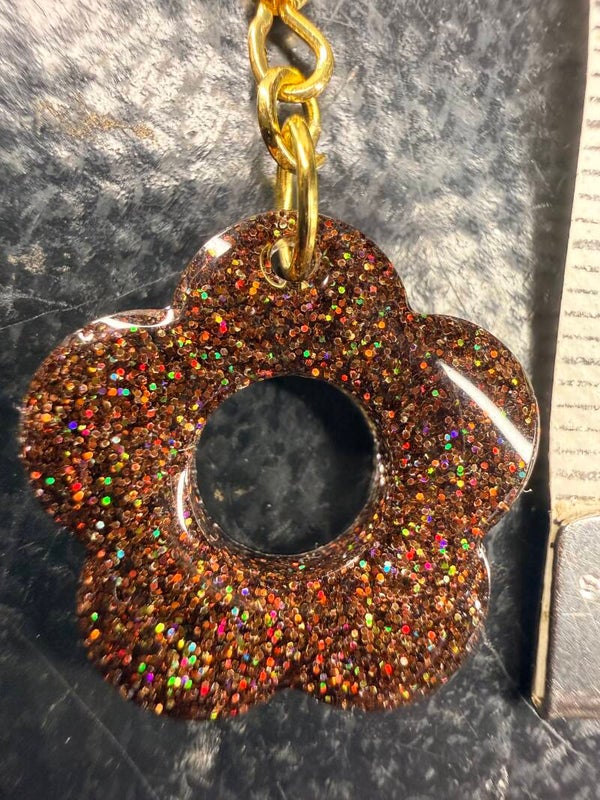 Leur résine translucide renferme une pluie de paillettes aux reflets cuivrés, évoquant les lumières dorées de l’automne. Chaque mouvement capte la lumière et révèle des éclats subtils, entre brun profond et scintillements lumineux.